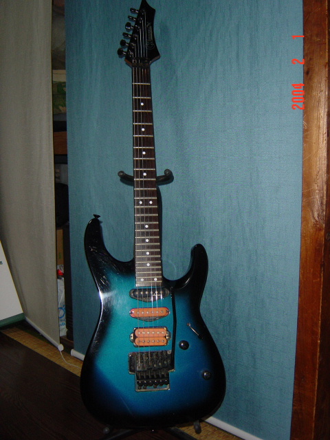 ・・・このギターは確か高二の時に買ったものだと思う。それまで使っていたギターがシングルコイルだったので、ただハムバッキングのギターが欲しかっただけで、別にメーカーやピックアップの配列には、こだわっていなかったと思う。このギターの特徴はとても軽くて、ネックの幅が狭くとても弾きやすい点である。ただピックアップはあまり良くなく、リアはディマジオのTONEZONEに、そしてセンターもディマジオのFS−1に積み替えてある。このセッティングにしてあることから、いかにこの頃からポールギルバートにハマっていたかということが解ると思う。現在このギターは、常に半音下げチューニングにセッティングされている。(売却済み)