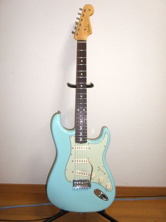 ・・・7本目のギターです。少し遅れて4年半後に購入しました(爆) このギターは運命的な出会いをしました。普段絶対に行かない場所にある楽器屋に、仕事帰りにわざわざ途中下車をして立ち寄りました。するとそこにこのギターがあったんです。チョイキズというか店頭展示による色焼けが原因で特価で出てました。ボディは今まで持ってなかったダフネブルーですが、写真を見てわかる通り、新品とは思えない程いい感じに色が落ちてます(笑) 初対面の日は購入せず、キープして貰って数日後にG&Lを持参して試奏ブースで弾き比べをして決めました。ほんと全然違いましたね。G&Lはとてもパワーがあってじゃじゃ馬。こっちはとても繊細。ネックもすごくしっくりきた。キープしている間にリペアマンがバッチリ調整してくれてました。今までオリジナルのストラトは持っていなかったのですが、ギターを始めて24年。。ここにきてやっと手にしました。音も純ストラトの音なのでとても気持ち良いです。そして購入してから証明書を見たら2008年製でした。4年もの間、誰の手にも渡らず、自分と奇跡的な出会いをしたのも、運命を感じずにはいられませんね。これからどんどん味が出てくると思うので、今からとても楽しみです。