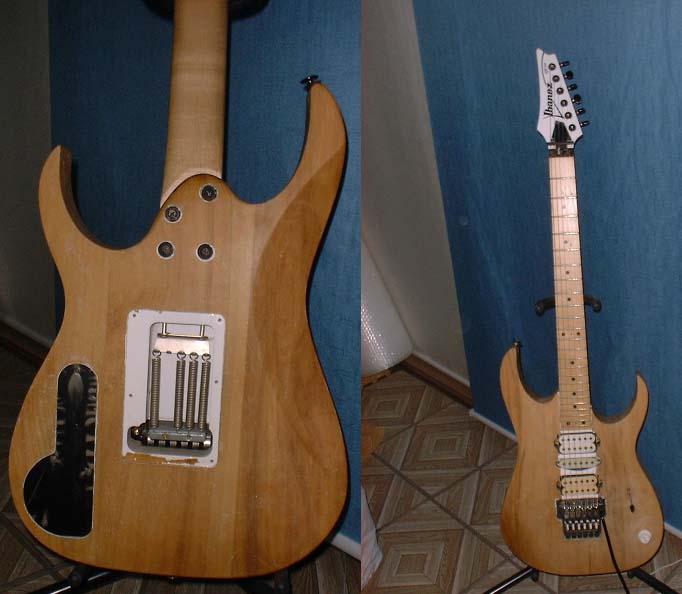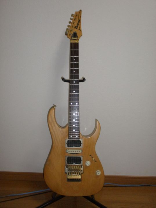 ・・・ご存知ポールギルバートモデルである。勿論自分で買ったわけではありません。下記のプリアンプ カメレオンと交換したのである。音はあのまんまですね! 僕は気にならないのですがIbanez特有の薄いネックで、慣れてないと使いづらいかもしれません。でも 見かけもこのままでは使いづらいので、近いうち塗装をはがしてナチュラルオイルフィニッシュにしたいと企んでいる。。。ちなみに99年3月現在塗装は全て剥がし終えている。(売却済み)