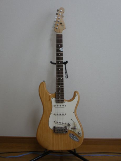 ・・・4本目のギターです。アンプを購入して何か新しいものを求めるかのように買ってしまった。このギターもアンプ同様運命的な出会いのもとで購入してます。ボディはナチュラルフィニッシュで、材にアッシュが使われていて少し重いです。フィンガーボードはローズウッドで、ネックにオイル等の塗装はされていません。5点ピックアップセレクターの他にツマミがあって、それを入れるとピックアップがリア+フロントになり、仮想テレキャスのような音も出せます。またペグはスパーゼルのロック式ペグでこれも非常に重宝します。その後に買った2本があるにも拘らずメインとして君臨しているニクいヤツ(爆) 2005年1月現在、キャビティ内の導電加工によるノイズレス処理、スイッチクラフト製ジャックへの交換、配線材をヴィンテージのものに交換。これによりハムノイズの軽減、及び全体の音がだいぶ前に出るようになりました。10年ものなのでボディの鳴りもかなりのもんです。