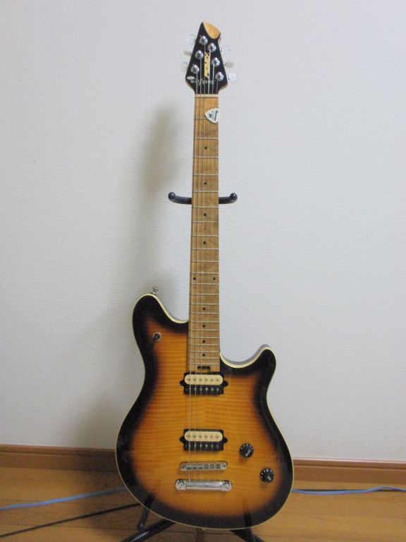 ・・・5本目のギターです。本当に4年後に購入しました(笑) このギターはオークションで中古で購入したもの。ボディはナチュラルサンバースト、ネックとフィンガーボードはバーズアイメイプル。購入のきっかけは、ヴァンヘイレンが好きなのはもとより、ボディシェイプが気に入ったこと、アーチドトップのギターが欲しかったこと、ノントレモロのギターが欲しかったこと、LIVE用にハムバッカーのギターが欲しかったことを合わせると、WOLFGANGがぴったりだったのです。弾き易さはもとより、音質もバリバリに歪んでいながらも音の分離がしっかりしていて最高です。メインというよりRECなどで必要な時に引っ張り出して使う感じになってます。あとはVAN HALENサウンドを堪能したい時とか(爆) 最近ではクリーントーンの秀逸さを新たに発見して酔いしれています。特にハーフトーンはかなり優秀。とても太く甘いトーンはまるで自分がジャズギターを奏でているかのような響きです。